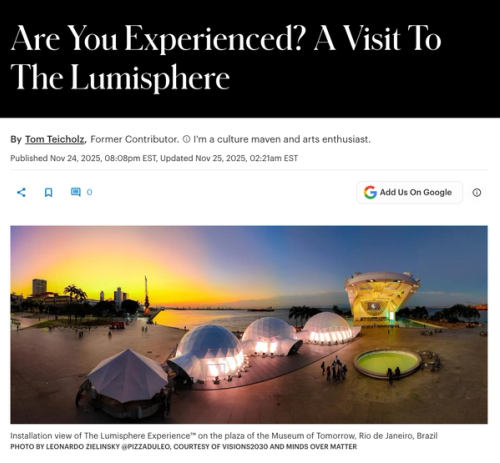 The Lumisphere Experience was first launched in 2023 on the campus of CalArts, a multidisciplinary art school and arts community, outside of Los Angeles in California. Thousands of visitors took part and validated that the experience caused a shift in their consciousness (however large or small). In Rio, The Lumisphere Experience can be visited until December 18, 2025, before touring to other locations.