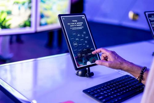 In Dome three, we surrendered our headphones, and each person in our group was given a tablet that asked a series of multiple choice questions about what your ideal living situation would be, what landscapes your ideal eco-future would have (urban, seaside, mountains, outer space, etc…) and whether they would want their environment powered by nuclear, wind, solar or none of those. The Ai then produced a image of that future living environment – and it is, in all the images I saw, quite beautiful.